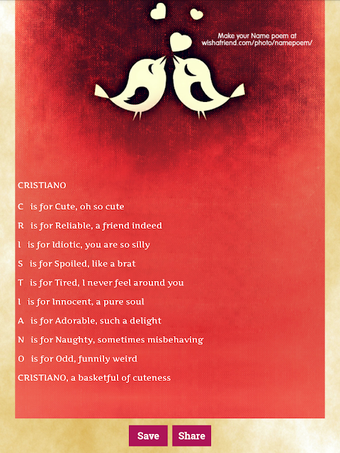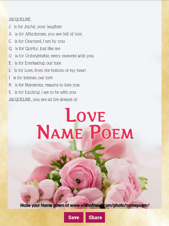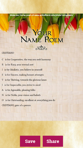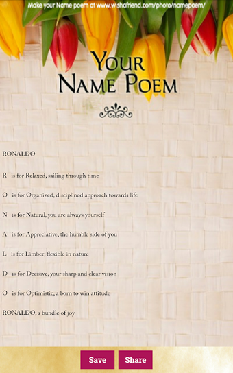 Name Meanings Poem Generator, kullanıcıların isimlerine özel şiirler oluşturmasına olanak tanıyan bir Android uygulamasıdır. Uygulama, kullanıcıların kendi isimleri, sevdikleri veya evcil hayvanları için kişiselleştirilmiş şiirler yaratmalarını sağlar. Kullanıcı dostu arayüzü ile istenilen kategori seçilir, isim girilir ve arka plan resmi seçilerek şiir oluşturulabilir. Oluşturulan şiirler, WhatsApp ve Facebook gibi platformlarda paylaşılabilir veya yazdırılarak çerçevelenebilir.